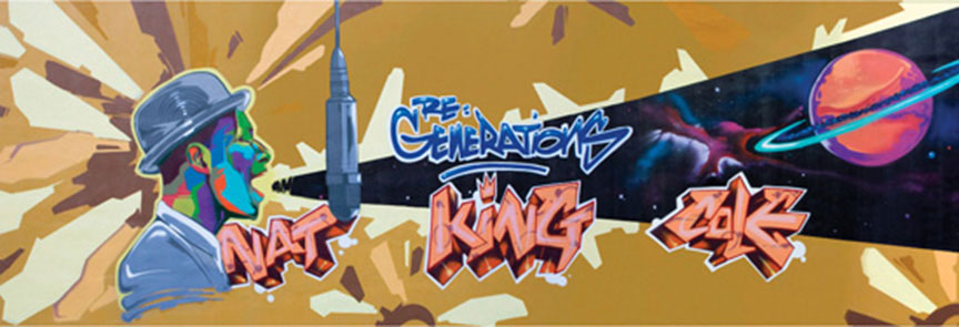 When Executive Producers Rick Camino and Michaelangelo L’Acqua at Capitol Records decided to re-invent, re-imagine and re-introduce the classic, iconic and legendary music of Nat King Cole to today’s contemporary music lover, they knew how important it was to align the visual branding with the music. For the music, they worked with cutting-edge producers such as Will.i.am, Cut Chemist, Brazilian Girls, Cee-Lo Green and NAS, among others. For the branding and visual design, they worked with us and our artists – namely Man One, Ritzy Periwinkle, Gustavo Vaca and Overton Lloyd. Together we designed and produced the “Re-Generations” logo and CD packaging design as well as a promotional art mural featuring Nat King Cole on a wall outside on the Capitol Records lot in Hollywood. The mural helped to build excitement for the project among the employees and was reprinted on the tri-fold panel inside the CD packaging.